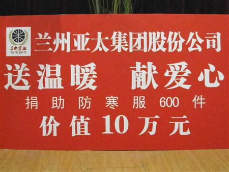 座谈会后在列位嘉宾下榻的——兰州中山宾馆二楼多功效厅 ,举行了2009年兰州esball集团股份公司“送温暖献爱心”公益运动捐助仪式和接待甘南地区诸位嘉宾的联谊会;兰州esball集团股份公司向导划分向兰州市色泽增进会交付防寒服300件价值五万元的捐助物资、向兰州市慈善总会交付防寒服300件价值五万元的捐助物资、向甘南州工商联交付防寒服600件价值十万元的捐助物资 ,本次公益捐助运动合计向兰州市周边三县区及甘南地区贫困户 ,捐助防寒服1200件价值二十万元;兰州市政协副主席、兰州市色泽增进会会长魏职勤、兰州市慈善总会副会长叶宏昌先后致辞 ,一定了esball企业多年来支持社会公益事业 ,发挥扶危助困的企业精神 ,在严寒的冬季为贫困户捐助急需的防寒服 ,体现出esball企业作为一个优异企业公民的高尚情操;甘南州工商联副主席贡保才旦体现 ,要把兰州esball集团股份公司的爱心捐助 ,发放到甘南地区急需资助的贫困户手中 ,让他们感受到社会各人庭来自各个方面的体贴资助 ,起劲事情振作精神一直提高生涯质量 ,同时对esball企业的爱心贡献体现谢谢。